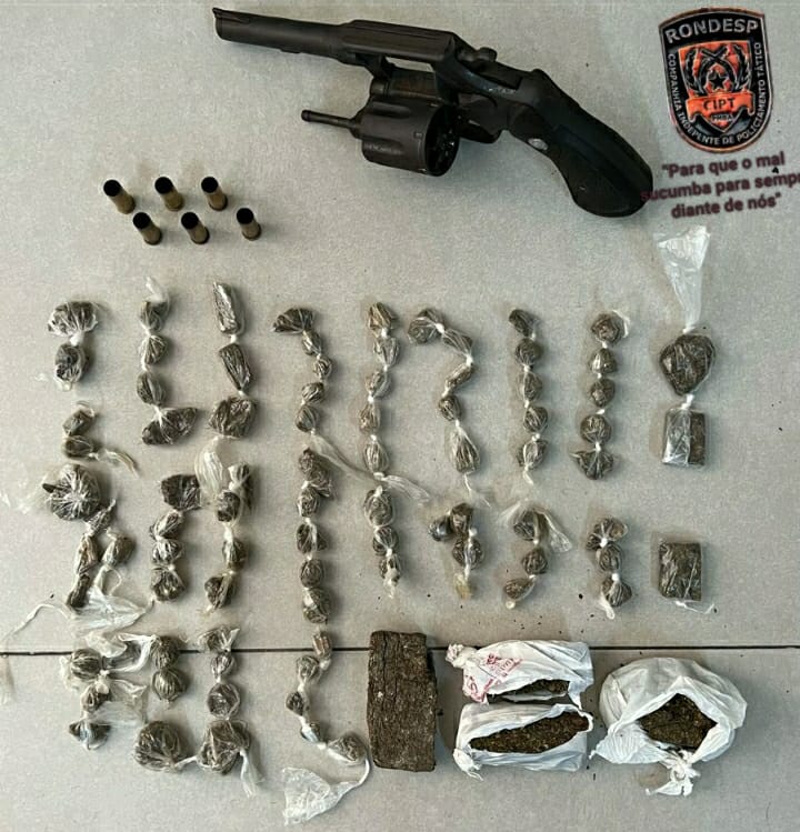 Com o agressor a polícia apreendeu; (85) buchas de maconha; (04) pedaços de maconha; (01) revólver calibre 38 e (06) munições deflagradas.