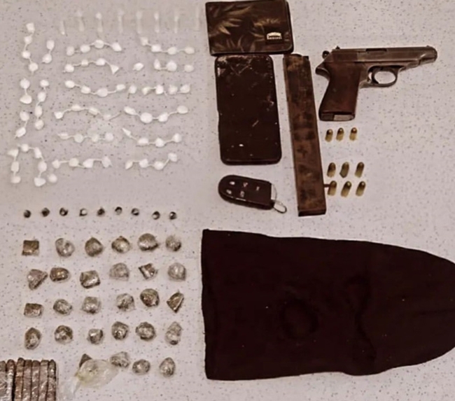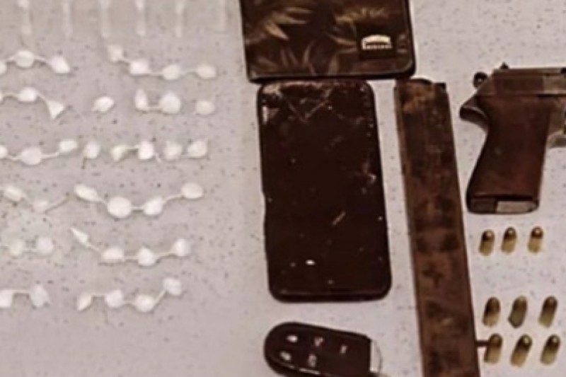 Os policiais apreendam uma pistola calibre .32, uma motocicleta CG Titan, um aparelho celular, 35 buchas de maconha, 9 pedras de crack e 87 papelotes de cocaína.