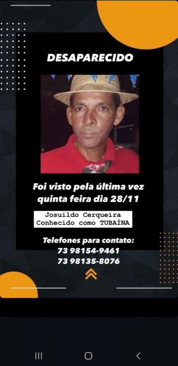 Quem tiver informações sobre o paradeiro do “Tubaína”, pode entrar em contato com a policia Militar pelo telefone 190. Ou ligar para os familiares, pelos telefones, (73) 9.8154-9461 ou (73) 9. 8135-8076.