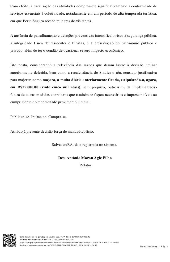 O Tribunal de Justiça da Bahia (TJBA) que já havia reconhecido a ilegalidade da greve dos servidores públicos municipal que compõem a Guarda de Porto Seguro e determinou a volta ao trabalho de medito, decide agora uma multa diária de R$ 25 mil ao Sindicato dos Guardas Municipais por descumprir a decisão de retorno às atividades.