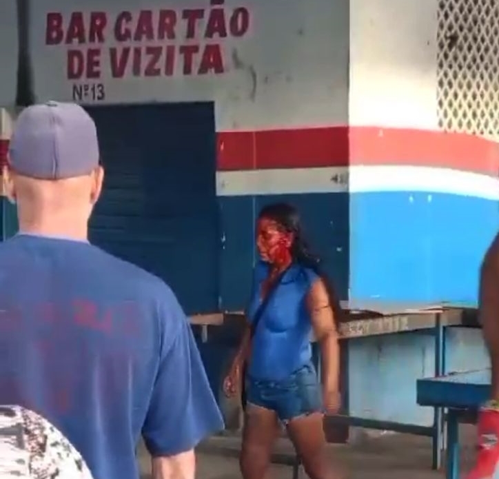 A mulher conhecida por Maria da “Faca” foi detida em flagrante pela polícia Militar. Um outro vídeo gravado por populares mostra o homem sentado sagrando no meio da rua.