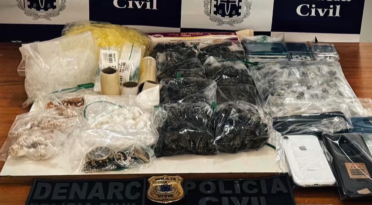 Segundo a Polícia Civil, os suspeitos foram flagrados dentro de uma casa usada para preparo e embalagem de entorpecentes. No local, foram apreendidos haxixe, crack, maconha, cocaína, balanças de precisão, embalagens e celulares.