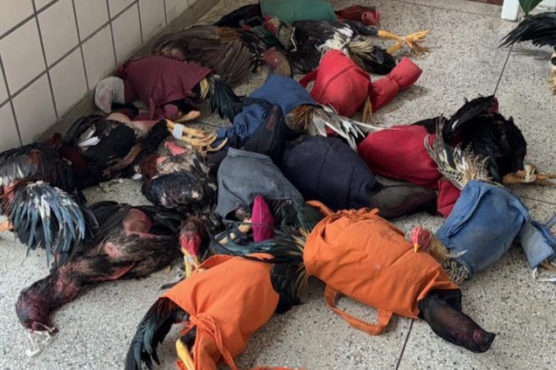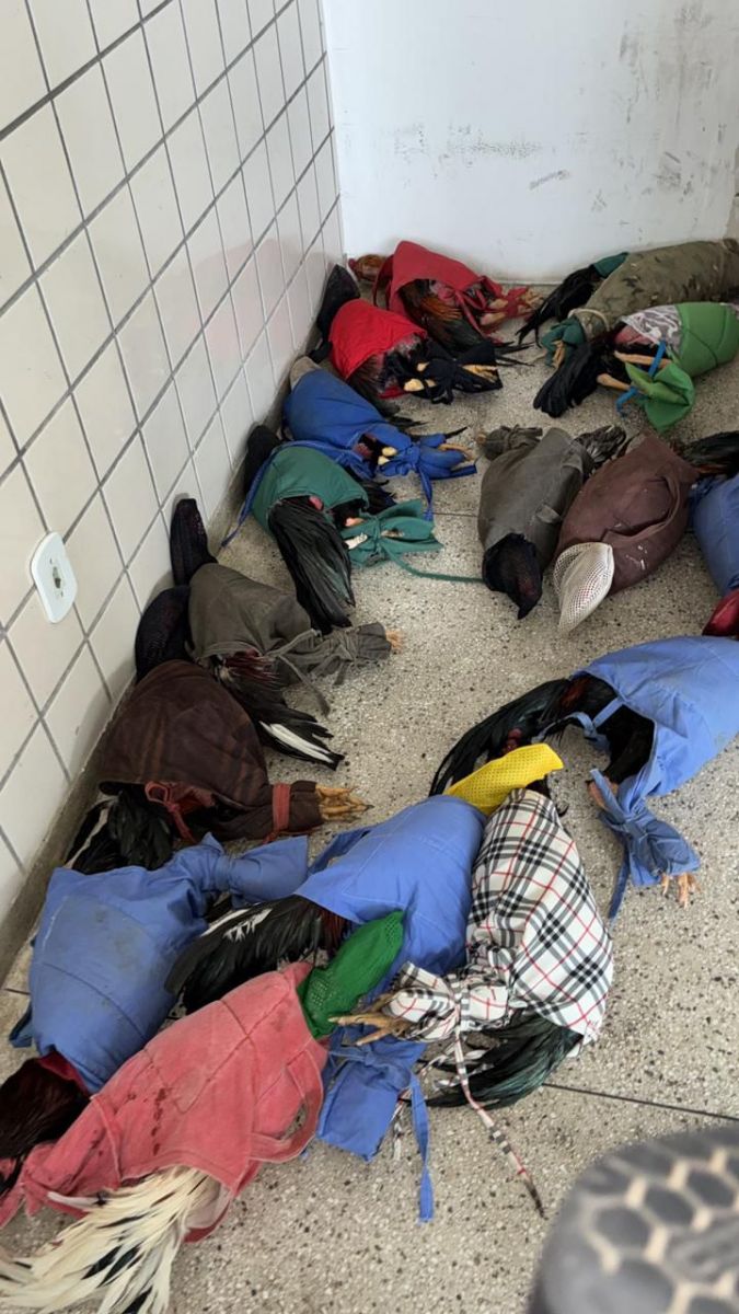 Durante a abordagem foram encontrados 34 galos de combate com sinais evidentes de maus-tratos — ferimentos, ausência de penas e manchas de sangue. Também foram apreendidos materiais usados nas rinhas, como 43 esporas artificiais, bornais, seringas, medicamentos veterinários, aplicadores, uma serra utilizada na preparação das esporas, uma balança, seis celulares e R$ 1.071,25 em dinheiro.