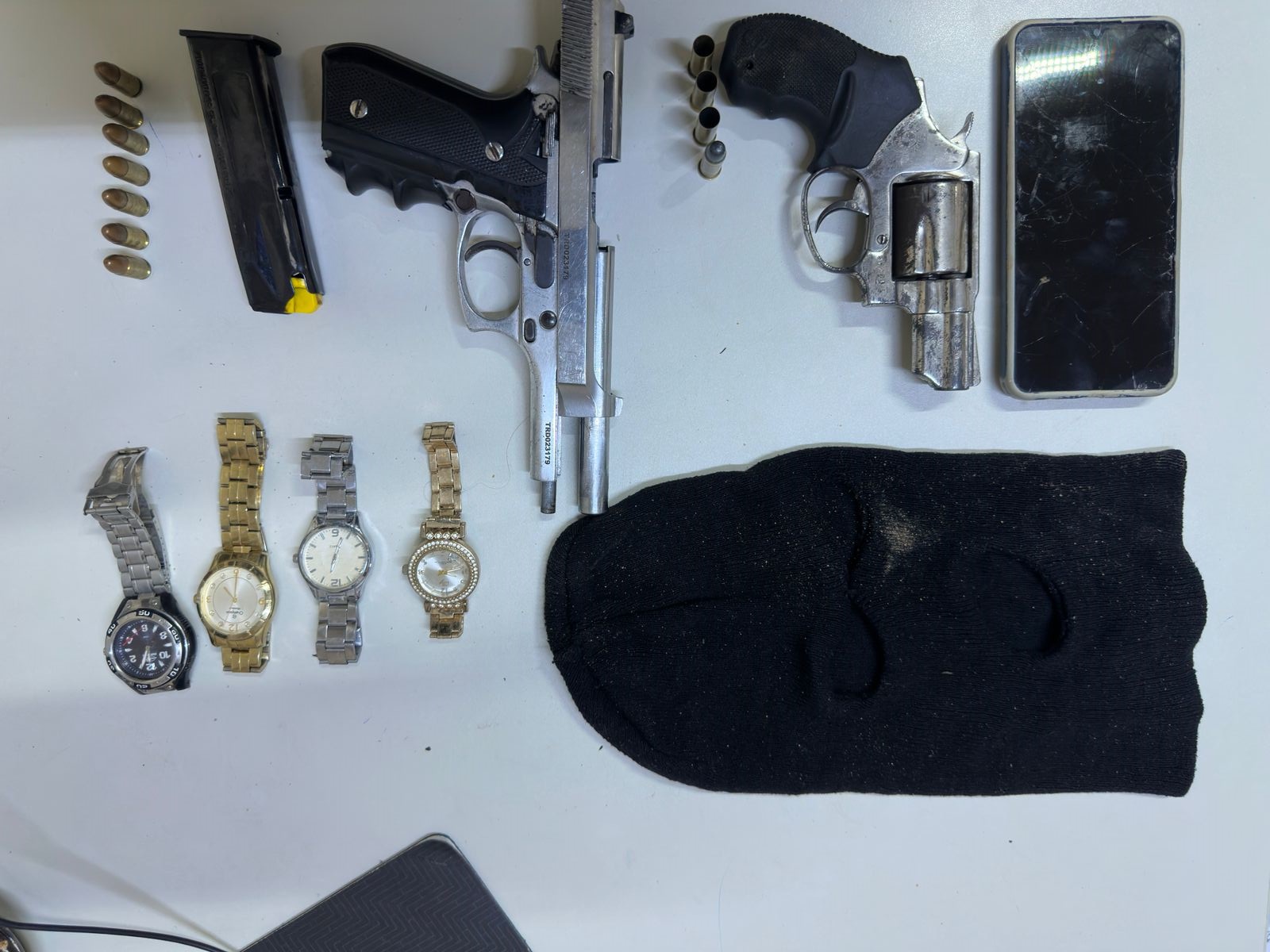 Com os indivíduos a polícia apreendeu uma pistola, um revolver, quatro relógios, sete cartuchos de pistola intactos, quatro muniçãões de revolver sendo três deflagradas, toca ninja, um celular e um carregador de pistola (frequentemente chamado de "pente" na linguagem popular) com munições.