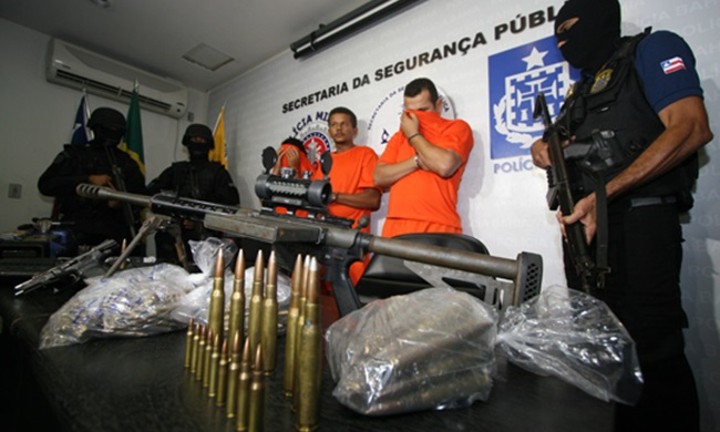 Quatro ladrões de banco foram presos em uma operação da polícia baiana na região Oeste da Bahia. Com eles, a polícia apreendeu uma metralhadora antiaérea, armamento capaz de derrubar um helicóptero e perfurar carros blindados. Participaram da ação as Polícias Civil e Militar, com apoio da Superintendência de Inteligência da Secretaria da Segurança Pública e do Ministério Público Estadual. Em nota, a polícia diz que se trata da “maior quadrilha” de assalto a banco do estado.
