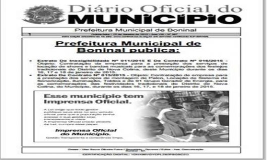 A prefeitura do município de Boninal, na Chapada Diamantina, publicou no Diário Oficial de quinta-feira (15) o extrato de dois contratos para um evento no Distrito de Nova Colina. Os contratos totalizam R$ 119 mil, para prestação de serviços de locação de show, bandas musicais, montagem de palco, sistema de sonorização, iluminação, toldos e gerador de energia.
