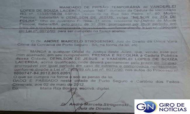 A Justiça expediu os mandados de prisão por latrocínio contra dois acusados de assassinar de forma brutal, Darlan de Jesus Nascimento, de 16 anos, Alessandro Ofrai de Jesus, de 17, e Edson da Silva Francisco, de 18, ambos moradores do distrito de Monte Pascoal, no município de Itabela. O triplo assassinato ocorreu na manhã de sexta-feira, no dia 18 de novembro 2011.