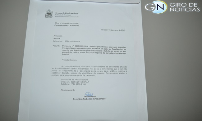 O ofício da moção de repudio foi encaminhado no mesmo dia ao Gabinete do Governador Rui Costa. No dia seguinte, o Governo do Estado, respondeu a nota através do oficio de nº o2067/2015/ separ.