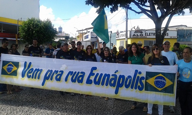 Os manifestantes que se reuniram em ato contra a presidente Dilma Rousseff (PT) na manhã deste domingo (12),no centro de Eunápolis, voltaram a se concentrar na praça central para expor suas insatisfação contra o Governo petista.