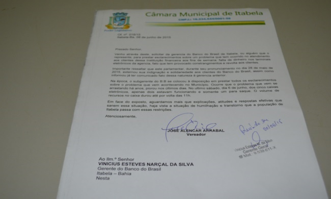 O vereador José Alencar Arrabal (PP), solicitou da gerencia do Bando do Brasil de Itabela, ou alguém que o represente, para prestar esclarecimentos sobre o problema recorrente na cidade aos fins de semana: falta de dinheiro nos caixas da agencia, que tem provocado revolta aos clientes.