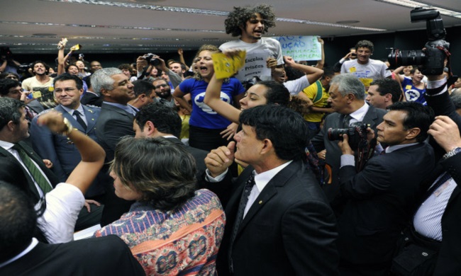 Um protesto truculento de militantes de partidos de esquerda e União Nacional dos Estudantes (UNE) interrompeu a reunião para votação do relatório do deputado Laerte Bessa (PR-DF) sobre a redução da maioridade penal na comissão da Câmara criada para discutir o tema.