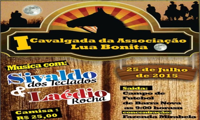 Além da satisfação de cavalgar você estará contribuindo com a recém-criada Associação Lua Nova, desfrutando shows com os artistas regionais, Sivaldo dos Teclados e Laédio. Preço da camisa R$ 25,00.e serão vendidos a partir da próxima semana com voluntários, em pontos de vendas e local do evento.