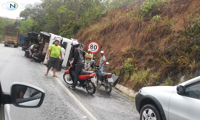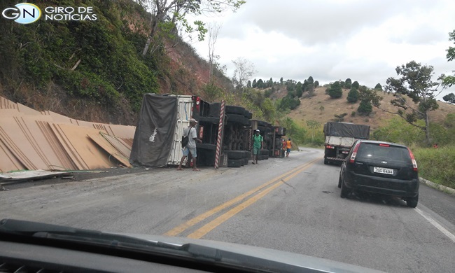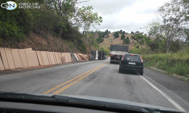 Parte da carga ficou espalhada pela pista. O motorista saiu do interior do caminhão pela janela do lado do carona.