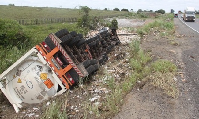 O acidente ocorreu na madrugada deste domingo (15), na altura do km 691 da rodovia, em um local conhecido como 'Curva da “Visgueira”. O produto segundo a Polícia Rodoviária Federal é altamente corrosivo, e iria descarregar na fábrica da empresa Suzano Celulose, localizada no município de Mucuri, no sul da Bahia.