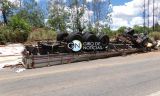 Carreta carregada com madeira tomba na BR-101, motorista fica preso nas ferragens.
