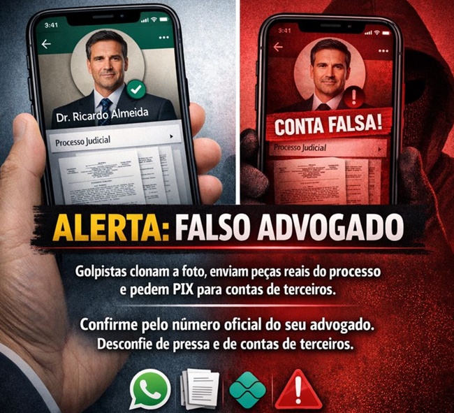 Nesta quarta-feira (04/01/2026), o advogado Dr. Ricardo Almeida, que teve sua imagem e identidade profissional clonadas por criminosos, fez um alerta público. Segundo ele, essa tem sido a fraude mais recorrente no estado nos últimos cinco meses.