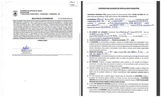 De acordo com o registro policial, o proprietário da locadora Menorah LTDA, localizada no centro de Itaberaba, firmou contrato de locação com um cliente, Paulo Augusto da Silva, conhecido como “Paulo do Mamão”, para utilização de um veículo Chevrolet Onix, ano 2014, pelo prazo inicial de 30 dias, com valor diário de R$ 150. O contrato começou em 1º de outubro de 2024 e, segundo o comunicante, foi sendo renovado sucessivamente, com pagamentos realizados de forma parcelada.