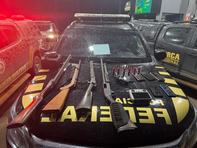 Durante a ação, foram apreendidas cinco armas de fogo e aparelhos celulares. Na área em conflito fundiário, ocupada por supostos indígenas, equipes das Polícias Militar, Civil e Federal localizaram duas espingardas calibre 12, um rifle calibre 38 e dois revólveres calibre 38. Os armamentos estavam enterrados em uma área de mata fechada, próxima ao local onde as vítimas foram atacadas.