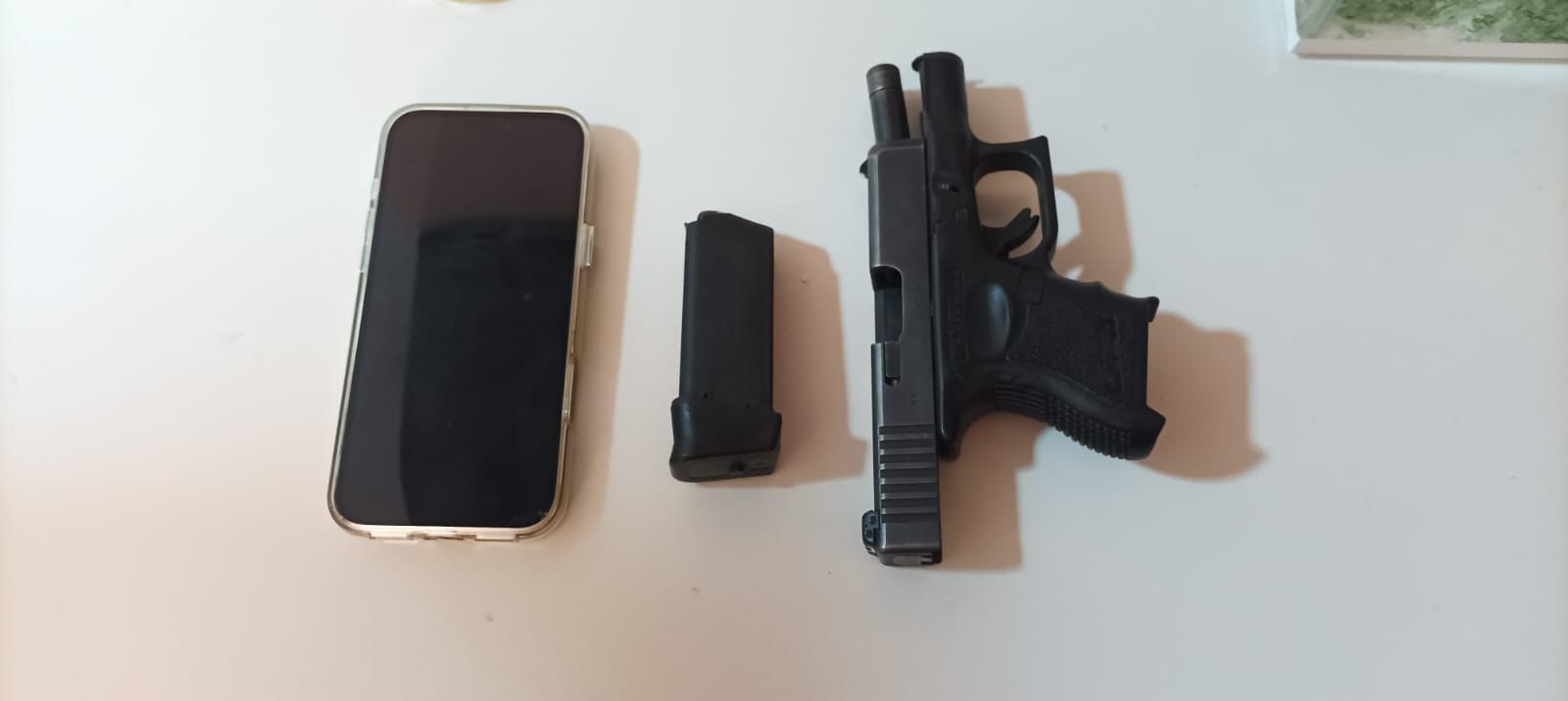 Segundo informações, uma pistola calibre .380 da marca Glock, com a numeração raspada, foi encontrada dentro de um cesto de roupas na residência do presidente da Câmara.