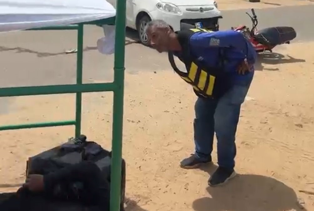Devido ao sol muito quente, um comerciante vizinho disponibilizou uma ajuda e colocou um pano para cobrir a vítima.