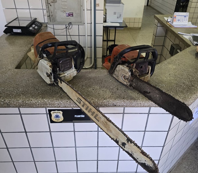 Na ação, foram apreendidas duas motosserras, um caminhão azul da marca Mercedes-Benz, placa KHN-5G04, e um caminhão branco modelo VW/17.220, placa JQJ-9C90.