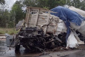 Caminhoneiro morre e outro fica gravemente ferido na BR-101, em Itabela após batida entre caminhão e carreta que presta serviços para a Veracel. Uma mulher que viajava de carona no caminhão também morreu