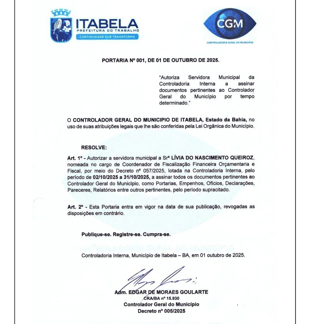 A Portaria nº 001, de 01 de outubro de 2025, foi assinada pelo próprio controlador e dando a servidora os poderes de assinar todos os documentos, como Relatórios, Portaria, Empenhos, Ofícios, Declarações, Pareceres, entre outros pertinentes, pelo prazo supracitado.