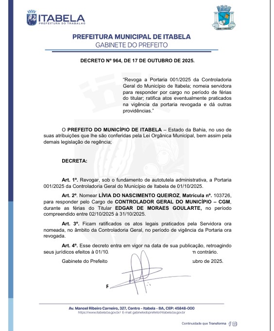 Art. 4º. Esse decreto entra em vigor na data de sua publicação, retroagindo seus jurídicos efeitos à 01/10/2025, revogando-se as disposições em contrário. Gabinete do Prefeito Municipal de Itabela, BA, em17 de outubro de 2025.