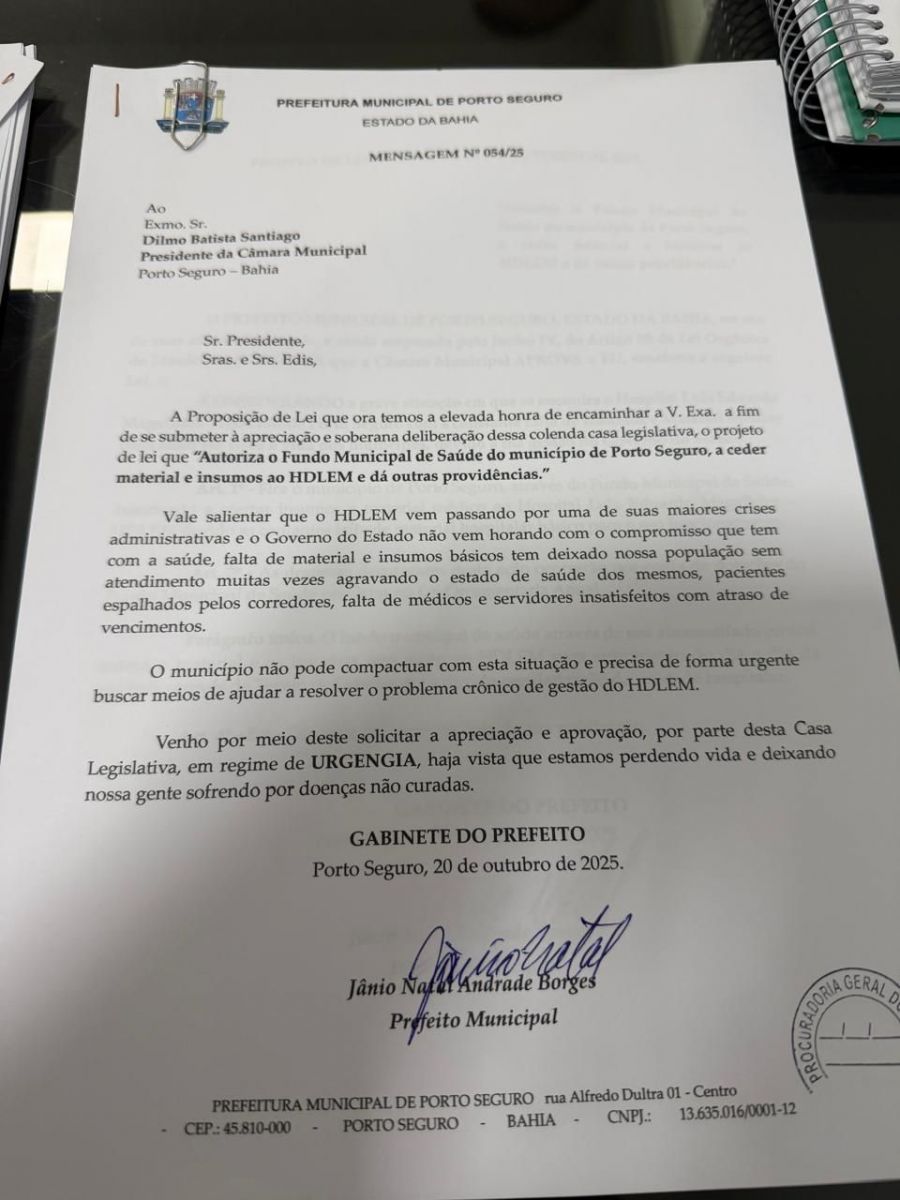 O Prefeito de Porto Seguro, Jânio Natal, em entrevista, na terça-feira, 20 de outubro de2025, informou que enviou um Projeto de Lei para a câmara de vereadores, que prevê fornecimento de insumos por parte da prefeitura para o Hospital de Base Luiz Eduardo Magualhães-