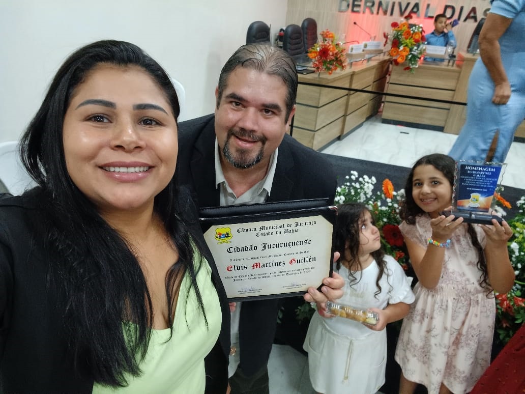 O médico Dr. Elvis Martinez Guillen, é o mais novo detentor do Título de Cidadão de Jucuruçu. A homenagem foi concedida na tarde do dia 04/12/2025, no plenário da Câmara Municipal de Jucuruçu. A cerimônia foi conduzida pelo presidente da Casa, Maria Nilza Loyola.