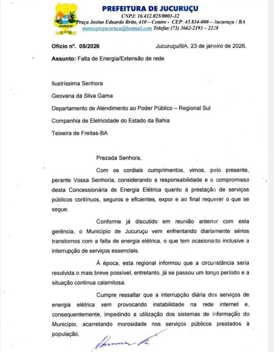 A Prefeitura de Jucuruçu informou que encaminhou um ofício à Coelba no dia 23 de janeiro de 2026, mas, até o momento, nenhuma medida concreta foi adotada. “Encaminhamos as denúncias novamente para a Neoenergia Coelba e aguardamos esclarecimentos da concessionária”, informou a gestão municipal.