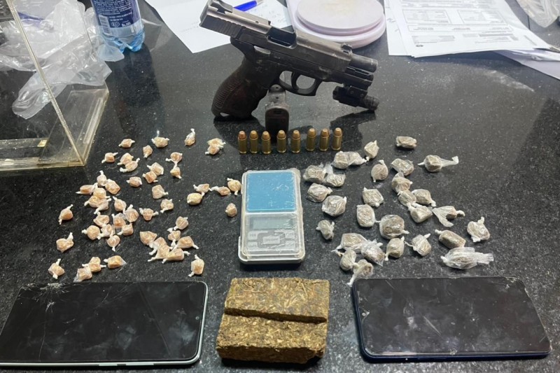 Durante a verificação, foram apreendidos um pedaço de maconha pesando aproximadamente 104 gramas, 30 buchas de maconha (31g), 50 pedras de crack (29g) e uma balança de precisão de cor prata.