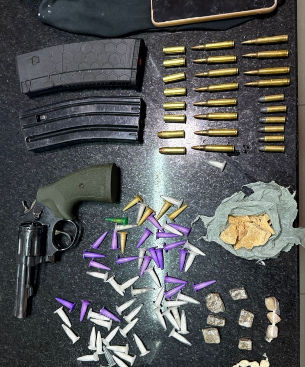Durante o acompanhamento, alguns indivíduos invadiram uma casa, ocorrendo um segundo confronto, sendo necessário o revide a injusta agressão. Cessados os disparos, um indivíduo, neutralizado, foi encontrado com um revólver Taurus cal.38 num. raspada e uma mochila contendo 62 pinos de cocaina 39g,