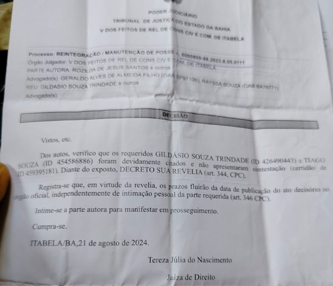 A família vive no lote há cerca de 14 anos e afirma possuir documentação que comprova o direito à posse da área. Após o ocorrido, Rosilda registrou boletim de ocorrência e ingressou com ação judicial. Em 21 de agosto de 2024, a juíza Tereza Júlia do Nascimento, titular da Comarca de Itabela, concedeu sentença favorável à assentada, após os citados no processo não apresentarem contestação, sendo o caso julgado à revelia.