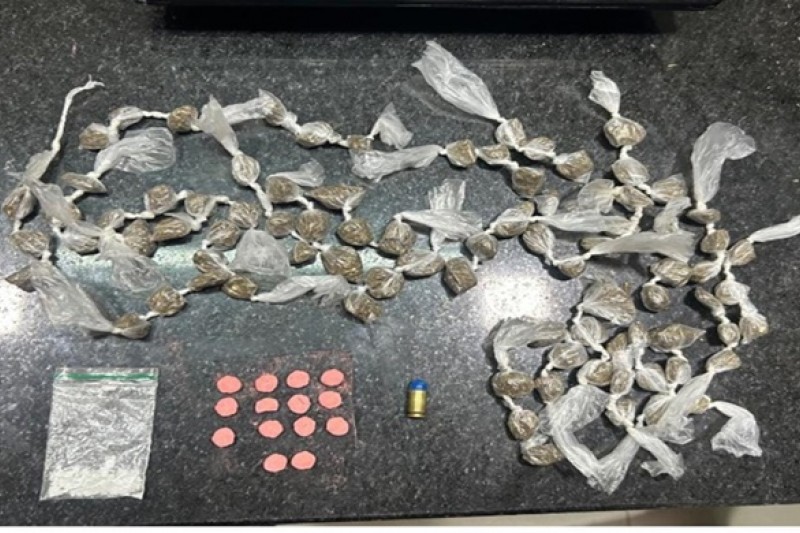 Durante a revista, foram encontrados diversos materiais ilícitos na sacola. A suspeita, identificada como Tamires Ferreira da Silva, resistiu à prisão, sendo necessário o uso da força e de algemas para contê-la.