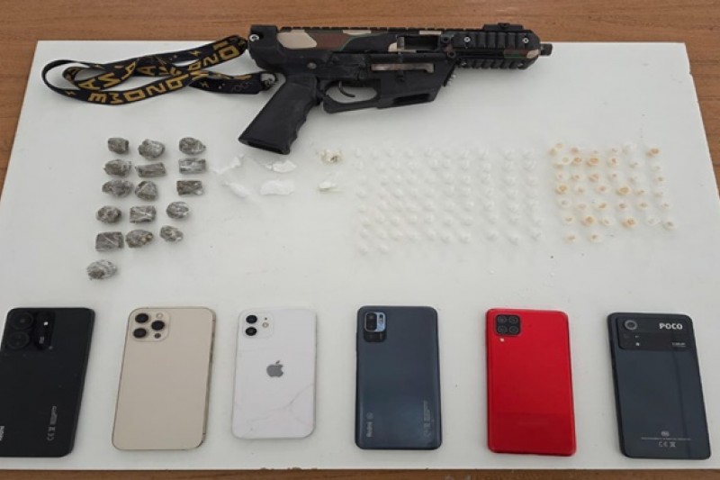 Durante a varredura no local, os militares encontraram uma submetralhadora calibre 9mm, além de uma sacola contendo grande quantidade de drogas e aparelhos celulares.