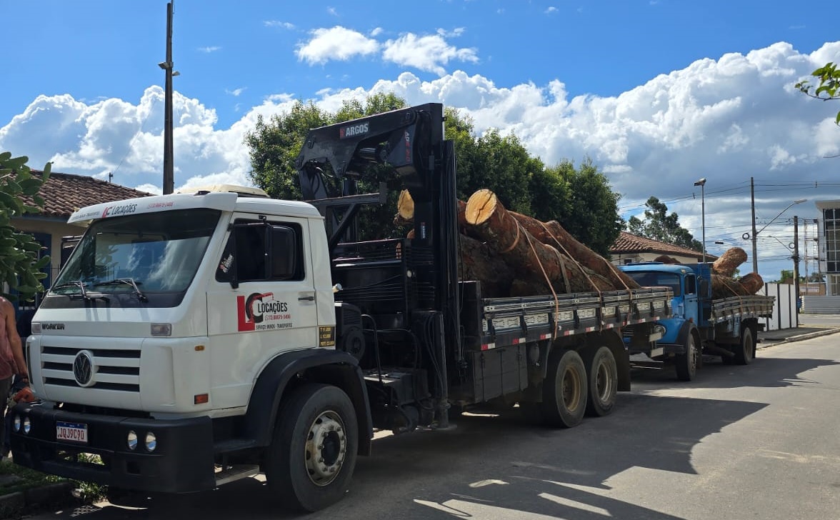 Na ação, foram apreendidas duas motosserras, um caminhão azul da marca Mercedes-Benz, placa KHN-5G04, e um caminhão branco modelo VW/17.220, placa JQJ-9C90.