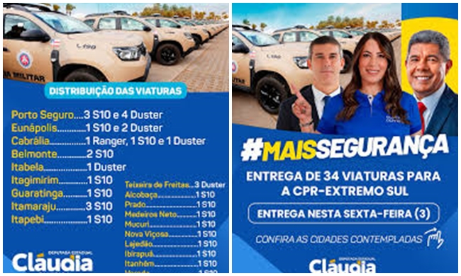 "A nova viatura foi conquistada por meio de indicação de emenda parlamentar da deputada estadual Cláudia Oliveira e entregue oficialmente pelo secretário de Relações Institucionais do Estado, Adolpho Loyola, representando o governador Jerônimo Rodrigues, com a presença do secretário de Segurança Pública da Bahia, Marcelo Werner e o comandante-geral da PM, coronel Magalhães".