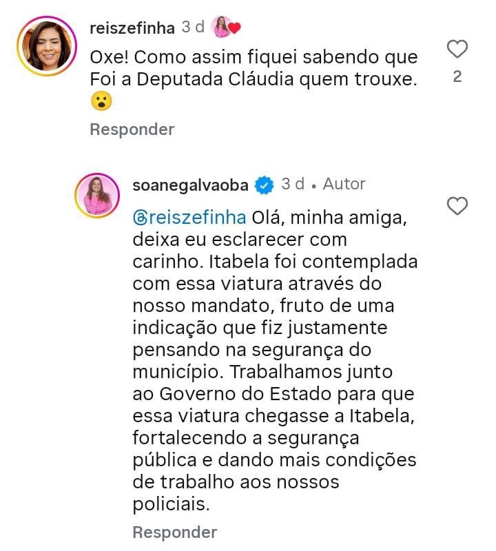 O próprio prefeito chegou a dizer que foi uma emenda da deputada Claudia Oliveira. O que parece que esqueceram de combinar as falas, de quem seria a dona da emenda que resultou na troca dos veículos, de um modelo melhor por um pior. O mais impressionante, as demais cidades receberam S10 e Ranger e Itabela uma Duster,