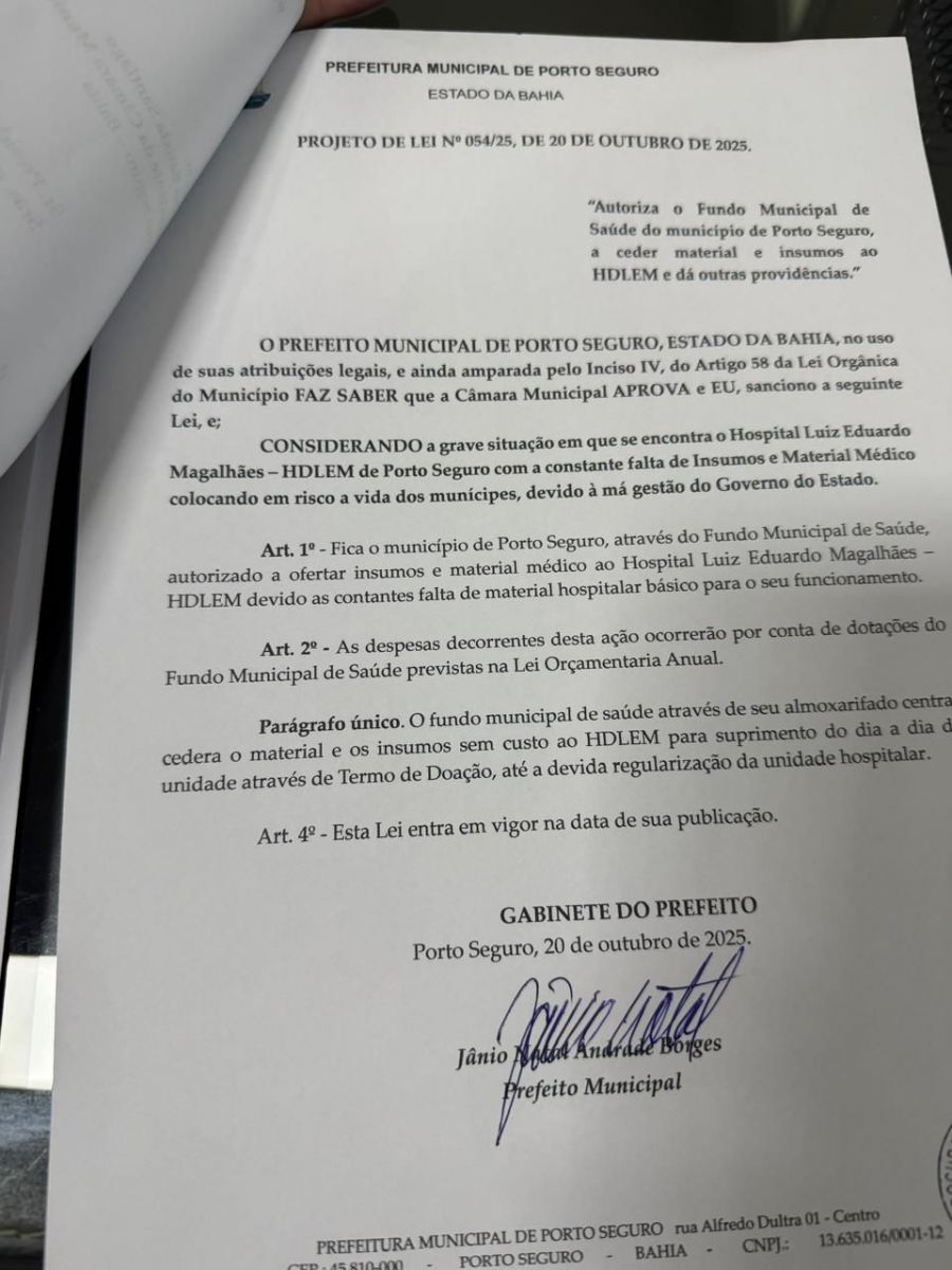 O Prefeito de Porto Seguro, Jânio Natal, em entrevista, na terça-feira, 20 de outubro de2025, informou que enviou um Projeto de Lei para a câmara de vereadores, que prevê fornecimento de insumos por parte da prefeitura para o Hospital de Base Luiz Eduardo Magualhães-
