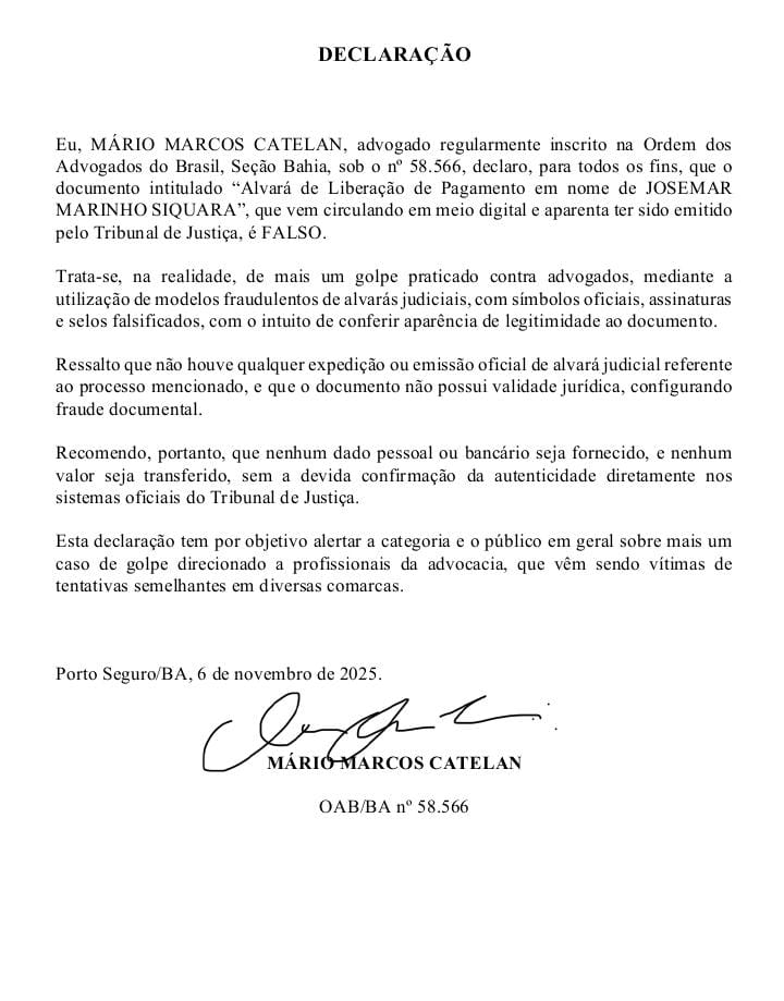 Após novas apurações, foi constatado que o referido documento — um suposto “Alvará de Liberação de Pagamento” — é falso, conforme declaração oficial do advogado Mário Marcos Catelan (OAB/BA nº 58.566), que informou a existência de um golpe praticado com o uso indevido de nomes, assinaturas e símbolos oficiais.
