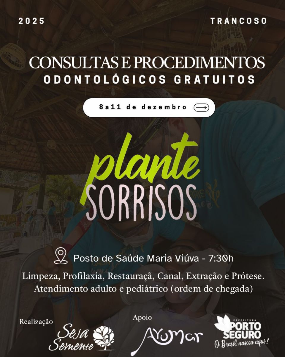 Entre os dias 8 e 11 de dezembro, Trancoso recebe a ação Plante Sorrisos, na Unidade de Saúde do Maria Viúva, a partir das 7h30, que vai oferecer consultas e procedimentos odontológicos gratuitos à população. A iniciativa é resultado da parceria as empresas Seja Semente, com apoio da Ayumar e a Prefeitura de Porto Seguro, por meio da Secretaria Municipal de Saúde, Secretaria Municipal das Mulheres e coordenação do Litoral Sul, ampliando o acesso a serviços essenciais de saúde bucal.