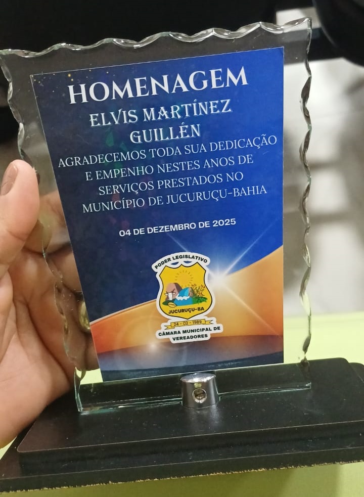 O médico Dr. Elvis Martinez Guillen, é o mais novo detentor do Título de Cidadão de Jucuruçu. A homenagem foi concedida na tarde do dia 04/12/2025, no plenário da Câmara Municipal de Jucuruçu. A cerimônia foi conduzida pelo presidente da Casa, Maria Nilza Loyola.