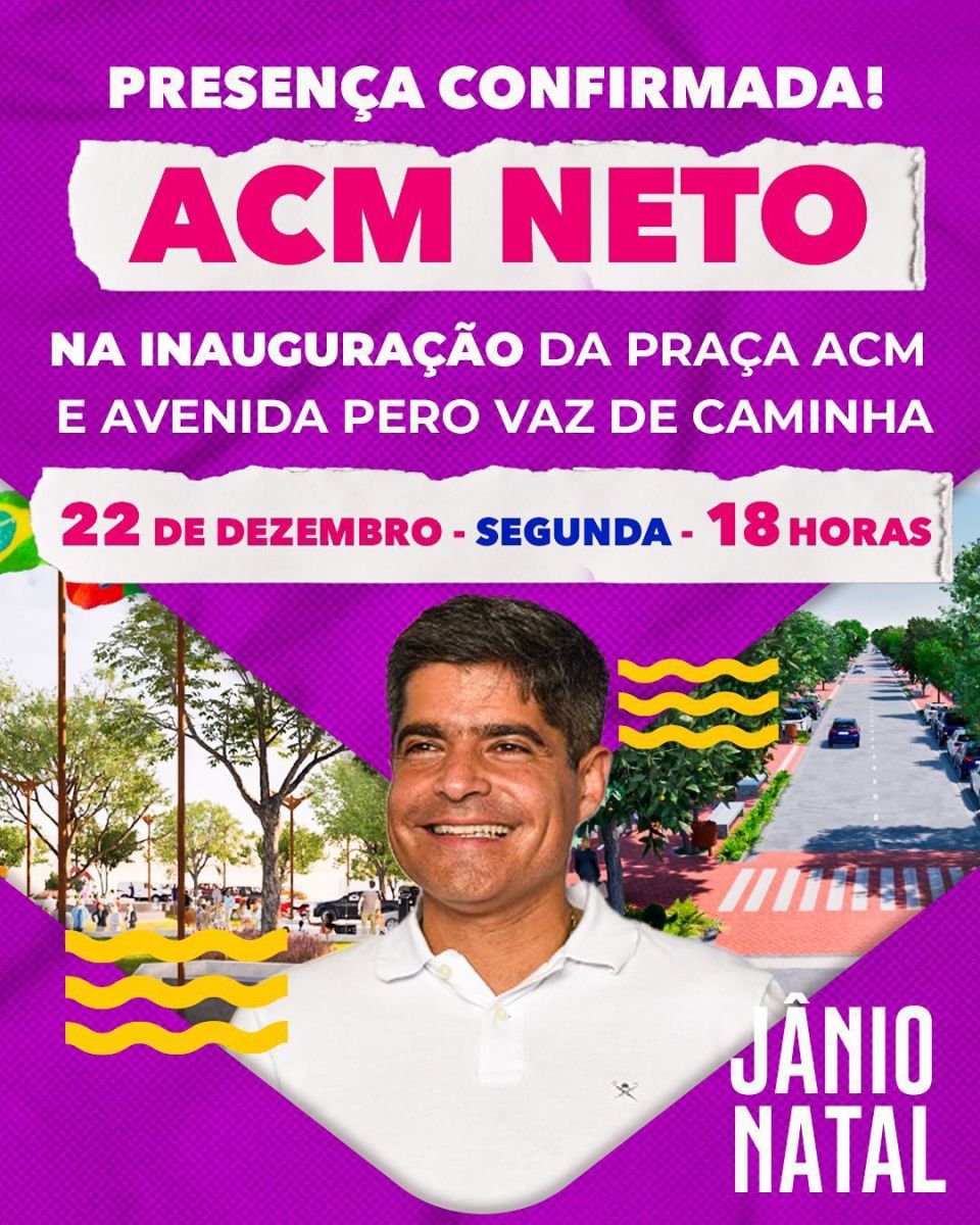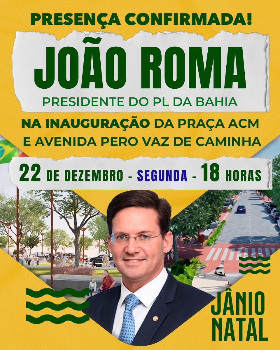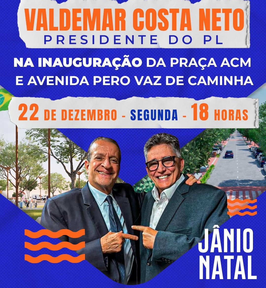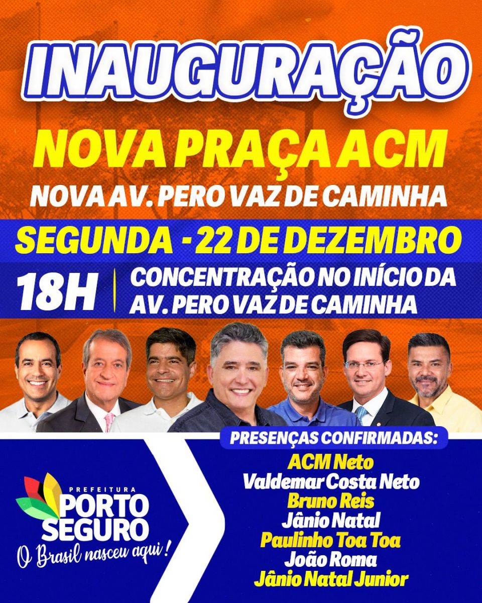 O Prefeito de Porto Seguro inaugura Praça ACM e nova Avenida Pero Vaz de Caminha, no dia 22de dezembro com a Presença de ACM Neto, João Roma, Bruno Reis e o presidente nacional do PL, Valdemar da Costa Neto.