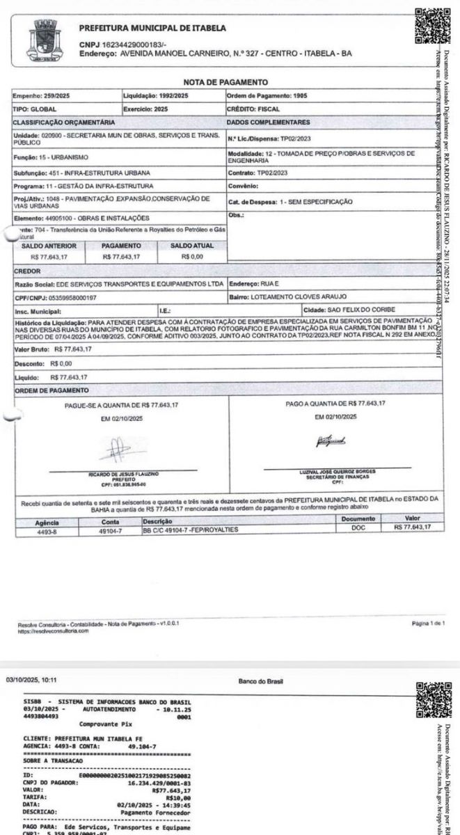 Consulta ao Tribunal de Contas dos Municípios (TCM) confirmou o pagamento, realizado em 02/10/2025, à empresa EDE Serviços Transporte e Equipamento LTDA. Os recursos são oriundos de transferência da União, provenientes dos royalties do petróleo e gás.