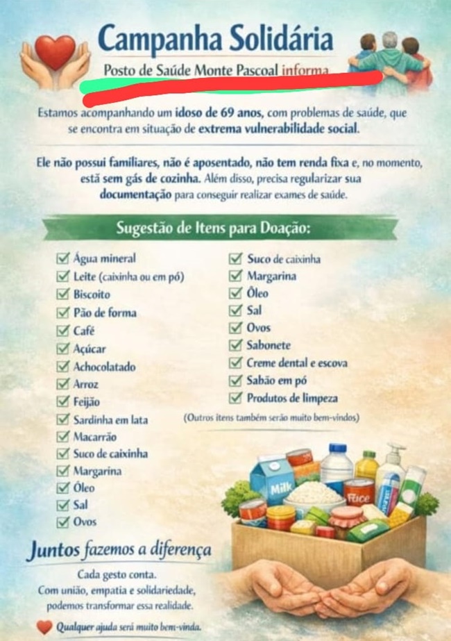 A Unidade Básica de Saúde (UBS) de Monte Pascoal, no município de Itabela, está promovendo uma campanha solidária em prol de um idoso de 69 anos que enfrenta sérios problemas de saúde e vive em situação de vulnerabilidade social.