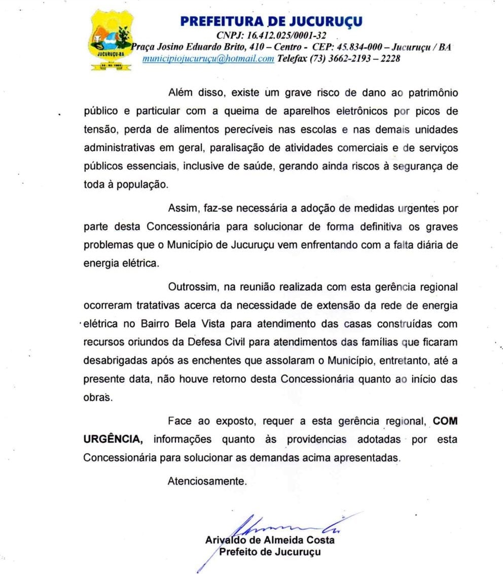 A Prefeitura de Jucuruçu informou que encaminhou um ofício à Coelba no dia 23 de janeiro de 2026, mas, até o momento, nenhuma medida concreta foi adotada. “Encaminhamos as denúncias novamente para a Neoenergia Coelba e aguardamos esclarecimentos da concessionária”, informou a gestão municipal.